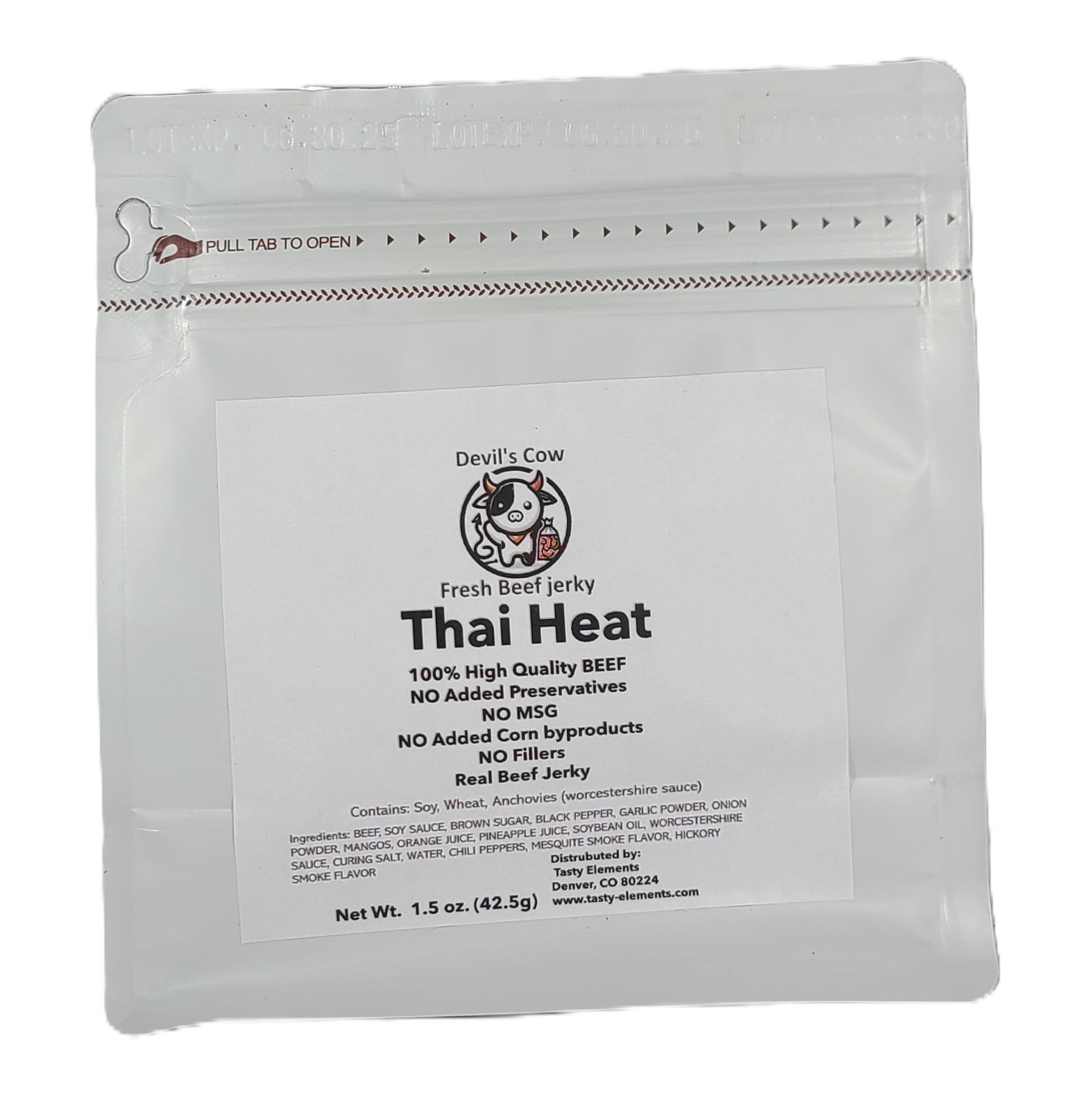 Discover the Ultimate Snack Experience with Our High Quality Beef Jerky!! Searching for a snack? Look no further! Our Devil's Cow beef jerky - Thai Heat is made with high quality beef, natural ingredients, this beef jerky is seasoned to perfection and slow cooked to create the best texture for a mouth watering treat in every bite. Low in salt and sugar, it is a high quality snack you can feel good about. Satisfy your cravings with Devil's Cow beef jerky.